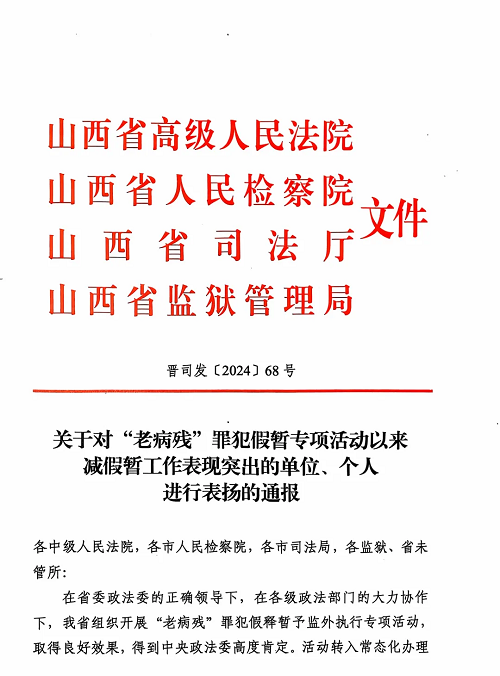 近日,山西省高級(jí)人民法院、山西省人民檢察院、山西省司法廳、山西省監(jiān)獄管理局印發(fā)《關(guān)于對(duì)“老病殘”罪犯假暫專項(xiàng)活動(dòng)以來(lái)減假暫工作表現(xiàn)突出的單位、個(gè)人進(jìn)行表?yè)P(yáng)的通報(bào)》,對(duì)減假暫工作表現(xiàn)突出的16家單位和25名個(gè)人予以通報(bào)表?yè)P(yáng),忻州中院審判監(jiān)督庭獲評(píng)“全省減假暫工作表現(xiàn)突出單位”。
