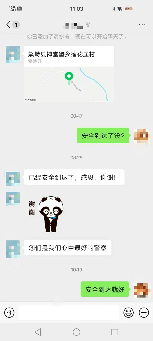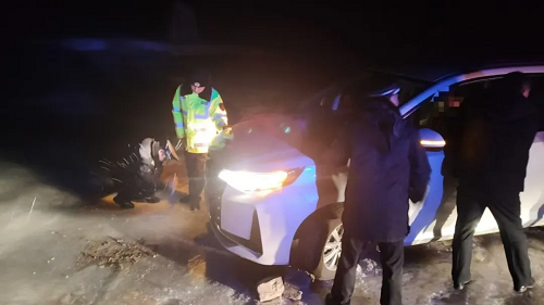 接到報(bào)警后,神堂堡派出所民警迅速通過電話聯(lián)系報(bào)警人,得知車上共有七人,多為婦女兒童,民警首先安撫游客情緒,并在確定具體地點(diǎn)后,立即與神堂堡交警中隊(duì)民警驅(qū)車趕往事發(fā)地。到達(dá)現(xiàn)場后,民警了解到,報(bào)警人張某與家人朋友自駕前往五臺山旅游,開到蓮花崖大峽谷山區(qū)路段時(shí)由于路面有冰導(dǎo)致車輛打滑沖出路面,車輛正被困在一處斜坡處,距離前面的深溝只有一米左右,進(jìn)退兩難,無法動(dòng)彈。此時(shí),車上幾名游客已凍得瑟瑟發(fā)抖,情況不容樂觀。民警們第一時(shí)間制定救援措施,他們不畏嚴(yán)寒、相互配合,經(jīng)過長時(shí)間的努力,終于將被困車輛從冰面推到了無冰路段。車輛脫困,游客對民警們的及時(shí)救援表示了由衷的感謝,緊緊握住民警的手,激動(dòng)地說:“非常感謝警察同志的幫助,您們是我們心中最好的警察!”