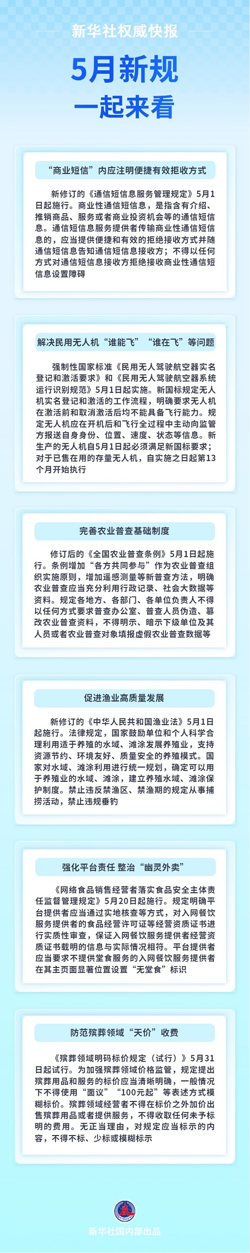 規(guī)定“商業(yè)短信”內(nèi)應(yīng)注明便捷有效拒收方式;解決民用無人機(jī)“誰能飛”和“誰在飛”等問題;完善農(nóng)業(yè)普查基礎(chǔ)制度……5月新規(guī),一起來看。