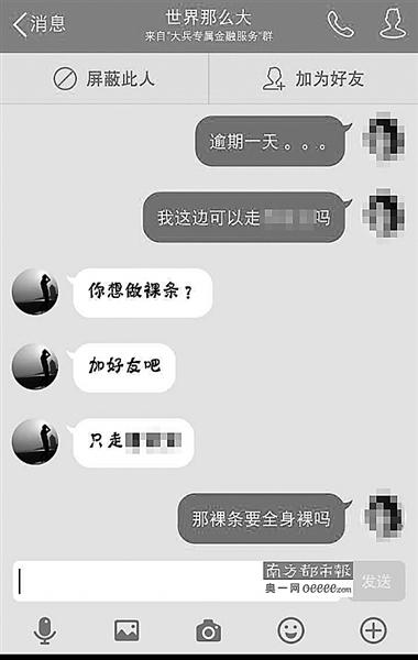 記者發(fā)現(xiàn),一些“裸持”借款的女大學(xué)生疑似遭遇出借人以“性服務(wù)”為目的的威脅,否則威脅稱(chēng)要將裸照發(fā)送給借款人的父母、朋友。