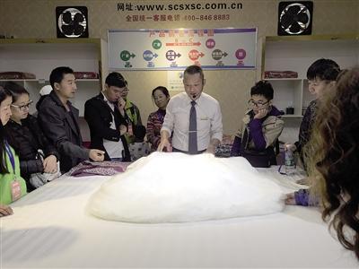 下午2點半,按照行程,旅行團將參觀蜀繡,旅行團被帶往一家門口寫有“蜀繡蜀錦科技文化展示中心”字樣的單位,但這家單位實際上是名為“依格爾”的床上用品直銷工廠。講解員簡單講解了有關(guān)蜀繡蜀錦的知識后,就把游客帶往一個展覽廳,向游客推介他們工廠的蠶絲床上用品,價格從3980到6980元不等。