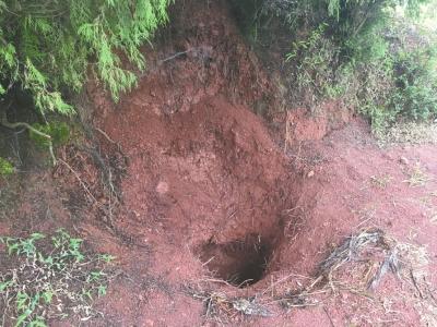 順著吳大爺?shù)闹敢?,記者穿過(guò)一片蘆葦?shù)?,整條山路雜草叢生,無(wú)路可尋。在山頂?shù)囊豢冒貥?shù)下,記者找到了尸體被埋處,一個(gè)約半米深、寬半米的泥坑,樹(shù)根裸露在外,周?chē)路哪嗤裂谏w了雜草。現(xiàn)場(chǎng)還有警方取證時(shí)留下使用過(guò)的一次性手套。