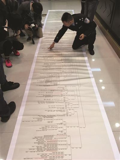 當時公安信息化不是很發(fā)達,家譜上的姓名和公安機關戶籍系統(tǒng)中的姓名有出入。民警將上千名家譜中的男性逐一翻拍,回南京后再根據翻拍的家譜照片,按照每一個人的血緣、親緣、家庭關系,逐人核對、逐人梳理。由于當地家族成員關系非常復雜,民警足足耗時兩個多月,制作出了一份長達6.8米的家譜關系圖。