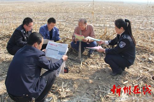 怎樣把《中華人民共和國(guó)大氣污染防治法》和《五臺(tái)縣人民政府嚴(yán)防森林火災(zāi)的通告》宣傳到人?五臺(tái)縣環(huán)境保護(hù)局、環(huán)境監(jiān)察大隊(duì)分組劃片,組織環(huán)保人員深入到田間地頭,面對(duì)面讀報(bào)給農(nóng)民聽,手遞手散傳單讓農(nóng)民看,為農(nóng)民解釋燒秸稈、燒地堰、燒荒等野外違規(guī)用火行為的危害。臺(tái)城鎮(zhèn)西關(guān)村66歲的農(nóng)民張存在就高興地對(duì)縣環(huán)境監(jiān)察人員說:“你們這樣解釋,咱懂,“地頭環(huán)?!痹坜r(nóng)民也記得牢,我家4畝地的秸稈保證不燒一根,咱漚糞去,多打糧,又不污染?!眻D為地頭宣傳環(huán)境保護(hù),增強(qiáng)農(nóng)民環(huán)保意識(shí)。(金俊賢 攝)