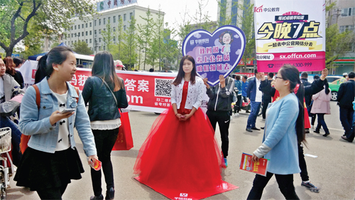 4月23日11點(diǎn)左右,記者在我市城區(qū)忻州一中校門(mén)口看到,一名身穿紅色婚紗裙的女生舉著牌子——“我媽說(shuō)了,考上公務(wù)員,咱們領(lǐng)證去”。當(dāng)天是2016年山西省公務(wù)員考試筆試的日子,這是一家公考培訓(xùn)機(jī)構(gòu)在考點(diǎn)附近進(jìn)行宣傳活動(dòng),宣傳者靚麗的外表、婚紗裙的著裝和新奇的廣告語(yǔ)吸引了很多考生的目光,甚至一些路人也駐足觀看。不過(guò),這種夸張的廣告詞,所謂的“考上公務(wù)員去領(lǐng)證”的想法是否正確,也應(yīng)該引起大家的反思。(許凈 攝)