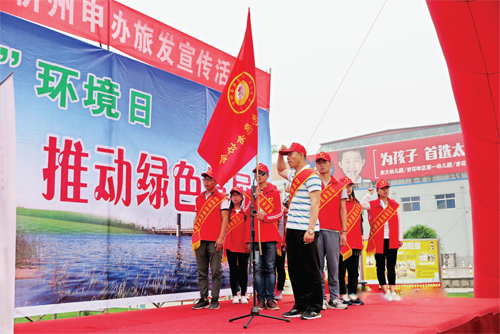 6 月5 日上午,第四十五個(gè)世界環(huán)境日宣傳活動(dòng)在我市體育廣場(chǎng)舉行。圍繞“改善環(huán)境質(zhì)量,推動(dòng)綠色發(fā)展”主題,市環(huán)保局開(kāi)展了百人騎行、文藝演出、助力忻州旅游投票等活動(dòng)。圖為我市環(huán)保志愿者協(xié)會(huì)志愿者代表正在宣誓。(王君 攝)