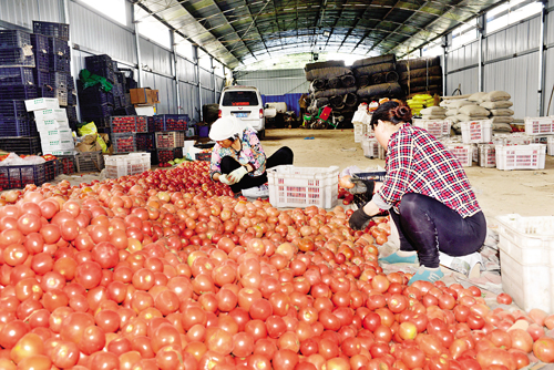 6 月22 日,定襄縣受祿鄉(xiāng)富達(dá)農(nóng)業(yè)合作社的農(nóng)戶們將采摘的西紅柿裝筐準(zhǔn)備外銷。近年來(lái),定襄縣立足自然資源優(yōu)勢(shì),積極引導(dǎo)農(nóng)民調(diào)整產(chǎn)業(yè)結(jié)構(gòu),大力發(fā)展設(shè)施農(nóng)業(yè),促進(jìn)了農(nóng)業(yè)增效、農(nóng)民增收。(張玉虎 攝)