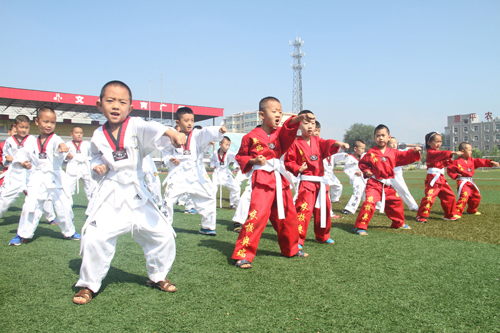 7月17日,孩子們在原平市農(nóng)校活動中心練習(xí)跆拳道。暑假期間,該市許多青少年投入到另一種學(xué)習(xí)狀態(tài),選擇學(xué)習(xí)跆拳道、舞蹈、書法、美術(shù)、音樂等,感受精彩的藝術(shù)世界,豐富暑假生活。(褚震 攝)