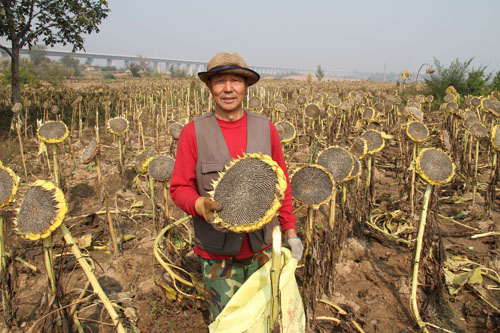 10月13日,原平市解村鄉(xiāng)圪坨村林同種植專業(yè)合作社正在收獲向日葵,該社引進三瑞公司種植1000余畝SH363向日葵喜獲豐收。近年來,該市積極引導農(nóng)民調(diào)整農(nóng)業(yè)產(chǎn)業(yè)結(jié)構(gòu),采取“合作社+農(nóng)戶”的模式,向日葵比玉米收入高四倍,銷售價每斤4塊左右,合作社為農(nóng)戶提供種子、種植技術(shù)等服務(wù),帶動當?shù)厝罕娫鍪罩赂弧?span style="font-family: 楷體,楷體_gb2312, simkai">圖為解村鄉(xiāng)村民趁著秋高氣爽的晴好天氣,在田間地頭葵花籽的情景。(褚震 攝)