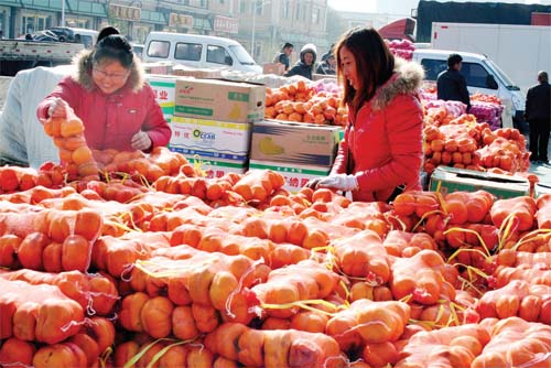11月11日,原平市農(nóng)貿(mào)市場上紅紅火火,這是市民們正在挑選金黃色柿子。該市合理化布局建市場,使農(nóng)副產(chǎn)品有了好的銷售平臺(tái),既方便市民購買又促進(jìn)農(nóng)民增收。(趙春曉 攝)