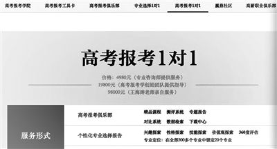 北青報記者發(fā)現(xiàn),面對考生家長對于志愿填報的“迫切需求”,目前高考志愿填報咨詢的價格都在幾千元到幾萬元不等。這位潘姓工作人員表示,該機構(gòu)設(shè)有線上、線下志愿填報兩套方案,其中線上填報方案價格為3980元,志愿填報咨詢老師與學(xué)生并不見面,而是通過QQ、郵件等方式為學(xué)生和家長出具志愿填報方案。而線下志愿填報方案為1對1有針對性的填報,但是根據(jù)咨詢經(jīng)驗的多寡收費也不相同?!氨热缥覀冇衅甙四晷袠I(yè)經(jīng)驗的呂老師收費是22800元,有6年經(jīng)驗的郭老師收費是20800元,要是有3年經(jīng)驗的李老師收費則為16800元。”此外,一家名為融聚未來的機構(gòu)的高姓負責(zé)人也向記者介紹,該機構(gòu)高考志愿填報1對1服務(wù)的價格在8000元到2萬元以內(nèi)。最讓人吃驚的是,一家名為贏鼎教育的高考報考機構(gòu),在官網(wǎng)上明示的高考報考1對1項目中明確標價,專業(yè)咨詢師提供服務(wù)的收費4980元,高考報考學(xué)創(chuàng)始團隊提供指導(dǎo)的收費為19800元,王海濤老師親自服務(wù)的標價為98000元。