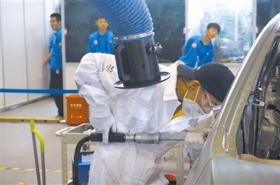 圖為世界技能大賽全國(guó)選拔賽汽車修理項(xiàng)目的比賽現(xiàn)場(chǎng),一名參賽選手正在檢查車身。