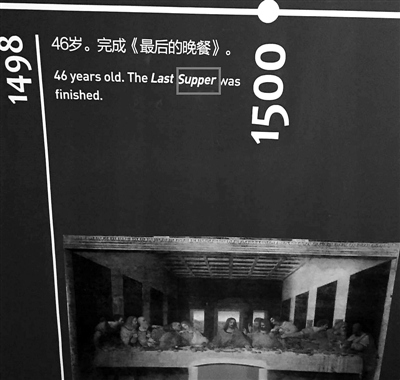 該網(wǎng)友發(fā)現(xiàn),在這個(gè)介紹達(dá)·芬奇生平的年表上,英文錯(cuò)誤不止一處:關(guān)于達(dá)·芬奇46歲的經(jīng)歷,展覽介紹說:“46歲。完成《最后的晚餐》”,其對應(yīng)的英文翻譯是“46 years old. The Last super was finished.”而super一詞在英文中的意思是“超級的”,“晚餐”的英文詞匯實(shí)為supper,該翻譯中少了一個(gè)字母“p”。