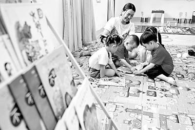 福建省晉江市第十實(shí)驗(yàn)小學(xué)教師子女托管室,老師為幼兒園放學(xué)后的孩子們講繪本。新華社發(fā)