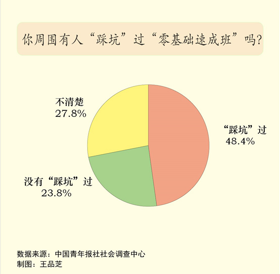 調(diào)查中,48.4%的受訪者表示周圍有人踩過“零基礎(chǔ)速成班”的坑,23.8%的受訪者表示沒有,27.8%的受訪者不清楚。