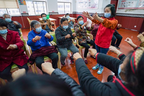 江蘇省鹽城市亭湖區(qū)大洋街道綜合養(yǎng)老服務(wù)中心,工作人員在帶領(lǐng)老人練習(xí)手指操。新華社記者 李博/攝