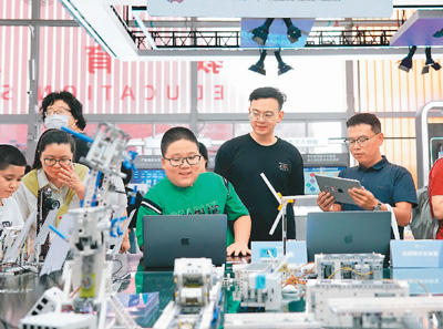 圖為在首鋼園教育服務(wù)專題展區(qū),小朋友在體驗智能硬件編程作品。