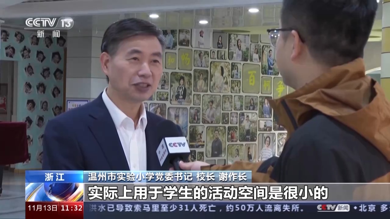 溫州市實(shí)驗(yàn)小學(xué)黨委書記、校長 謝作長:這個(gè)6.6平方米,聽起來好像并不小,但它包含了會(huì)議室、食堂、教師辦公室等等功能房,實(shí)際上用于學(xué)生的活動(dòng)空間是很少的,你看它只有省標(biāo)的三分之一左右呀。但是再怎么困難,課間十分鐘是必須讓孩子們放松。