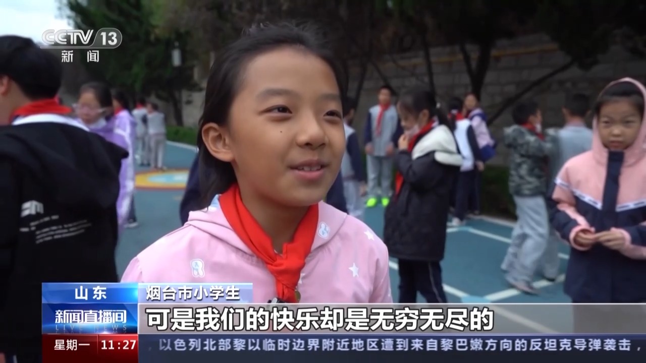 江蘇如皋市小學(xué)生 朱卉鈺:我感覺一下課出來玩,可以在外面玩玩游戲,在外面跑一跑就特別舒服。我希望下課的時(shí)間再長一點(diǎn),可以再玩一些游戲。
