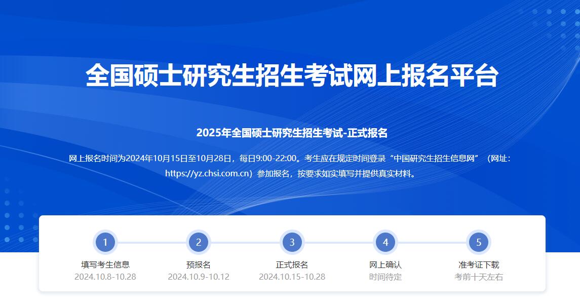 網(wǎng)上報(bào)名時(shí)間為2024年10月15日至10月28日(網(wǎng)上預(yù)報(bào)名時(shí)間為2024年10月9日至10月12日,相關(guān)工作安排由各省級教育招生考試機(jī)構(gòu)確定并公布),每日9:00-22:00??忌鷳?yīng)在規(guī)定時(shí)間登錄“中國研究生招生信息網(wǎng)”(網(wǎng)址:https://yz.chsi.com.cn)參加報(bào)名,按要求如實(shí)填寫并提供真實(shí)材料。