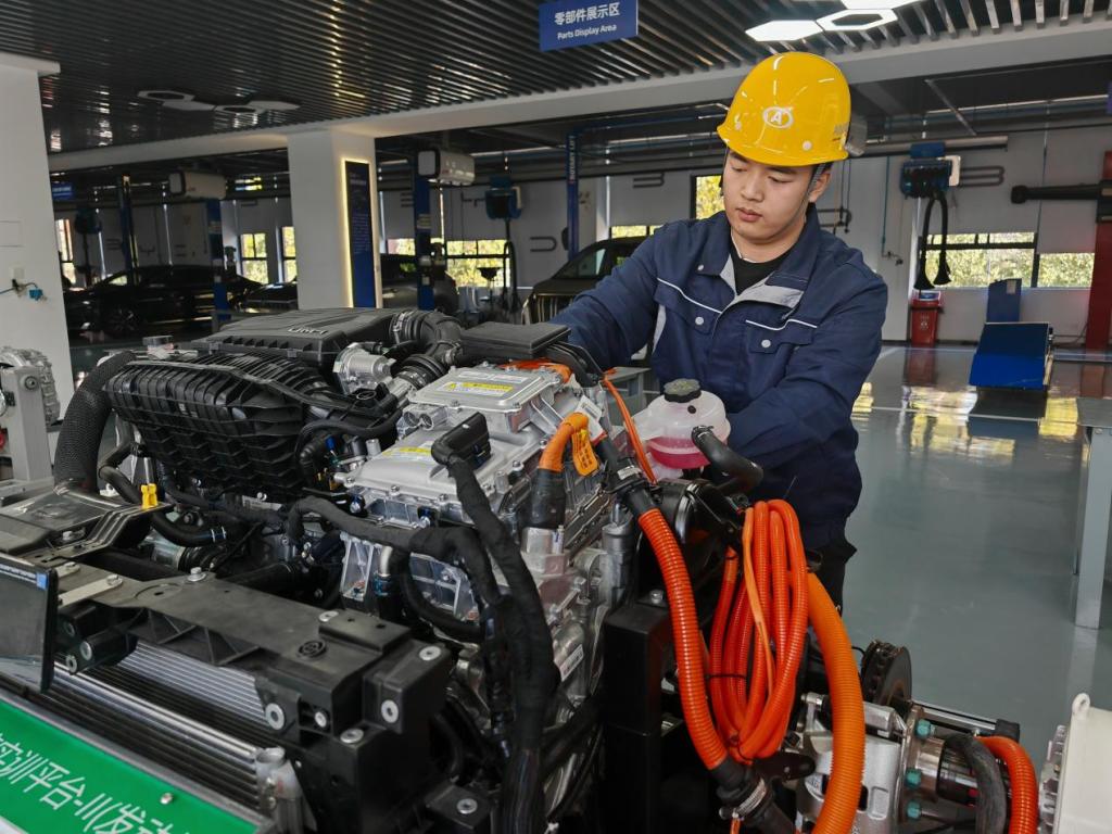 為支撐新能源汽車產(chǎn)業(yè)崛起,河南省全省高職院校開設(shè)相關(guān)專業(yè)點419個,相關(guān)在校生22.14萬人。在河南機電職業(yè)學(xué)院與比亞迪共建的現(xiàn)場工程師學(xué)院,圍繞“現(xiàn)場工程師”培養(yǎng)開發(fā)了37門項目化課程。該校每年向鄭州航空港區(qū)比亞迪工廠輸送1000余名技能人才,不少學(xué)生迅速成長為產(chǎn)線骨干?!皩W(xué)校通過‘項目+人才’雙交付育人模式,極大地增強了人才培養(yǎng)與企業(yè)需求的匹配度?!北葋喌峡傃b車間主任如是說。
