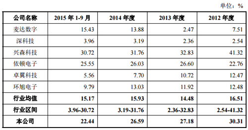 招股書顯示,易德龍負(fù)債水平偏高,流動(dòng)負(fù)債占比超過95%,面臨較大的短期償債風(fēng)險(xiǎn)。而除了償債風(fēng)險(xiǎn)外,公司主營(yíng)業(yè)務(wù)毛利率在報(bào)告期內(nèi)持續(xù)下降,2012年為30.31%,到2015年9月末已降至22.44%,而同時(shí)期內(nèi)行業(yè)銷售毛利率均值基本穩(wěn)定在27%左右。