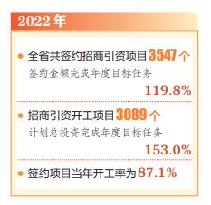 本報訊(記者閆杰)2月15日,記者從省投資促進(jìn)局獲悉,2022年,我省產(chǎn)業(yè)鏈精準(zhǔn)招商取得積極進(jìn)展。據(jù)統(tǒng)計,2022年,全省共簽約招商引資項目3547個,簽約金額完成年度招商引資簽約目標(biāo)任務(wù)的119.8%。招商引資開工項目3089個,計劃總投資完成年度目標(biāo)任務(wù)的153.0%,簽約項目當(dāng)年開工率為87.1%。全省招商引資形成固定資產(chǎn)投資項目到位資金完成年度目標(biāo)任務(wù)的225.8%,非固定資產(chǎn)投資項目到位資金完成年度目標(biāo)任務(wù)的202.7%。