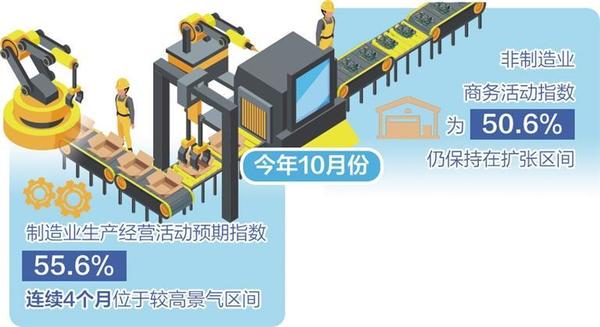從市場預(yù)期看,10月份,制造業(yè)生產(chǎn)經(jīng)營活動預(yù)期指數(shù)為55.6%,比上月上升0.1個百分點,連續(xù)4個月位于較高景氣區(qū)間,制造業(yè)企業(yè)對市場發(fā)展信心穩(wěn)定。