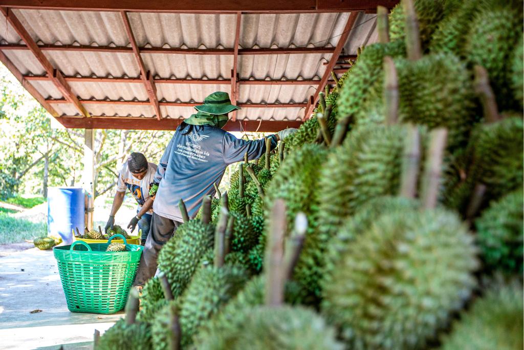4月26日,在泰國(guó)尖竹汶府,工人在榴蓮園碼放榴蓮。新華社記者王騰攝