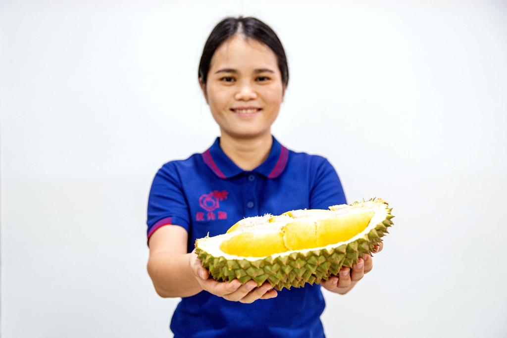 沙西通果園的榴蓮被采摘后,很快被運(yùn)到附近一家加工廠。這里,工人們忙碌地對(duì)新鮮榴蓮進(jìn)行分揀、稱重、打包、裝車。