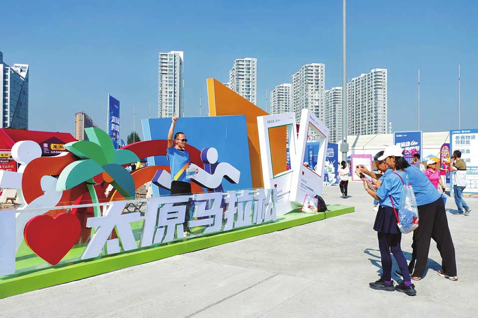 9月19日,2024太原體育消費(fèi)周啟動(dòng)儀式在省城晉陽(yáng)湖國(guó)際會(huì)展中心舉行。圍繞開(kāi)賽在即的太原馬拉松賽,體育消費(fèi)周在該中心推出互動(dòng)娛樂(lè)游戲、文體產(chǎn)品展示銷(xiāo)售、特色美食市場(chǎng)等十余項(xiàng)特色活動(dòng)。圖為參賽選手在展板前拍照留念。
