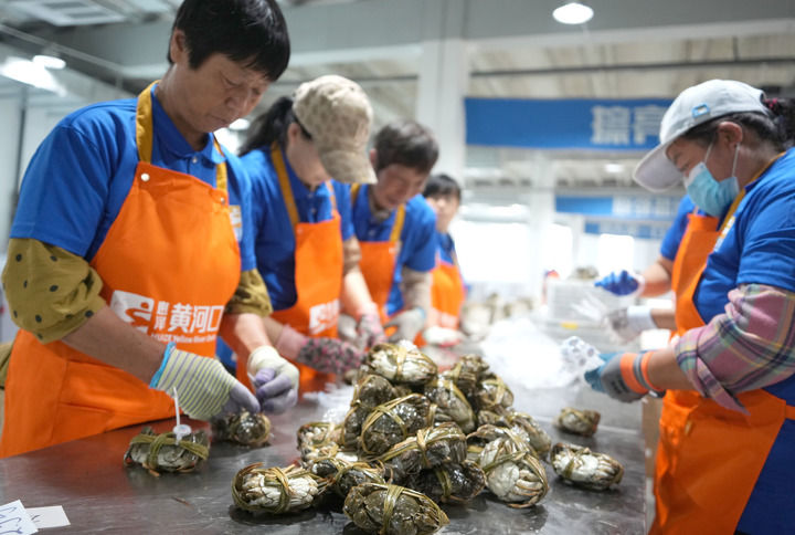 山東省東營市墾利區(qū)的一處大閘蟹加工車間的工作人員對(duì)新鮮的大閘蟹進(jìn)行分選和捆扎(2024年9月10日攝)。新華社記者 徐速繪 攝