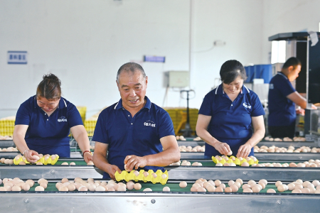 工作人員使用自動(dòng)吸蛋器將雞蛋放在保潔蛋流水線上進(jìn)行清潔干燥等。
