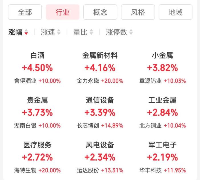 盤面上,白酒、金屬新材料、通信設(shè)備等行業(yè)板塊漲幅居前。概念板塊方面,稀土永磁概念大漲,帶動金力永磁、中鋼天源、領(lǐng)益智造等相關(guān)個(gè)股漲停;另,F(xiàn)5G概念、金屬鉛等表現(xiàn)亮眼。