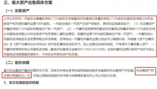 鑒于擬出售資產(chǎn)整體經(jīng)營狀況不佳,經(jīng)各方協(xié)商且參考經(jīng)國務(wù)院國資委評(píng)估備案的擬出售資產(chǎn)評(píng)估值,一汽夏利擬出售資產(chǎn)的交易價(jià)格確定為1元。