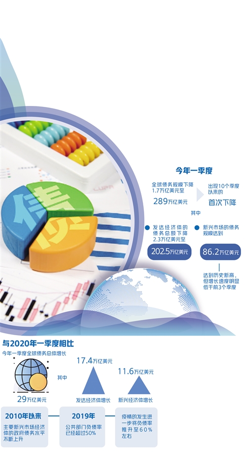 日前,國(guó)際金融協(xié)會(huì)發(fā)布了最新的全球債務(wù)監(jiān)測(cè)報(bào)告。好消息是全球債務(wù)規(guī)模在2021年一季度出現(xiàn)10個(gè)季度以來(lái)的首次下降;壞消息是全球債務(wù)規(guī)模體量巨大、償債能力不均衡等問(wèn)題依然存在。