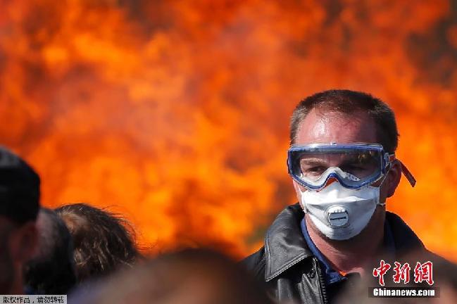 5月29日消息,近日,法國多個地區(qū)爆發(fā)示威,抗議勞工改革。防暴警察在巴黎和其他城市與抗議者對峙,77人被捕,15個警察受傷,汽車和商店遭到洗劫。圖為法國多杰斯的示威者設立燃燒路障,對勞工改革表示抗議。