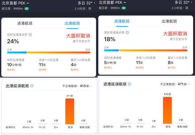 受各大航空公司退票處置方案的影響,航班大面積取消。飛常準(zhǔn)數(shù)據(jù)顯示,截至6月22日15時15分,北京首都國際機場當(dāng)日出港航班大面積取消,實時出港準(zhǔn)點率僅為24%,413架不正常航班中有411架航班取消出港;同樣,當(dāng)日入港航班大面積取消,實時入港準(zhǔn)點率僅為18%,471架不正常航班中有470架航班取消入港。