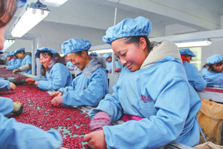 岢嵐有野生沙棘49萬畝。宋家溝功能食品有限公司是一家從事沙棘全產業(yè)鏈精深加工的開發(fā)企業(yè)。“市場上沙棘汁常見,但沙棘茶不多見?!笨偨浝韽埰G峰介紹,其實早在1977年沙棘就入了藥典,藥用價值、食用價值非常高?,F(xiàn)在人們對健康養(yǎng)生非常重視,為此,公司組織科研力量進行攻關,成功開發(fā)出沙棘茶,廣受市場歡迎?!拔覀円悦拷?元的價格從村民手里收購沙棘鮮葉,村民只要上趟山采摘,回來就能變成錢?!?/p>