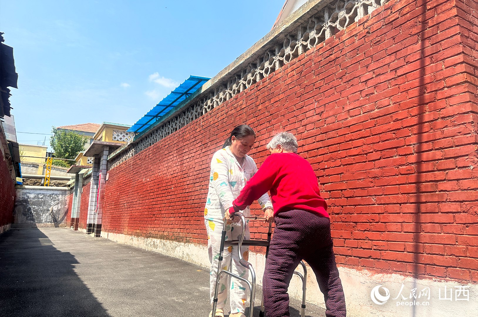 臨近中午,暖陽正好。村民李連香正扶著77歲的母親康復訓練。李連香微微將助步器向前移動,母親跟著緩緩向前。跟母親聊聊小時候的故事,問問她想吃什么……一言一語間,母女二人面對面慢慢移動著,走累了,就原地歇一會。