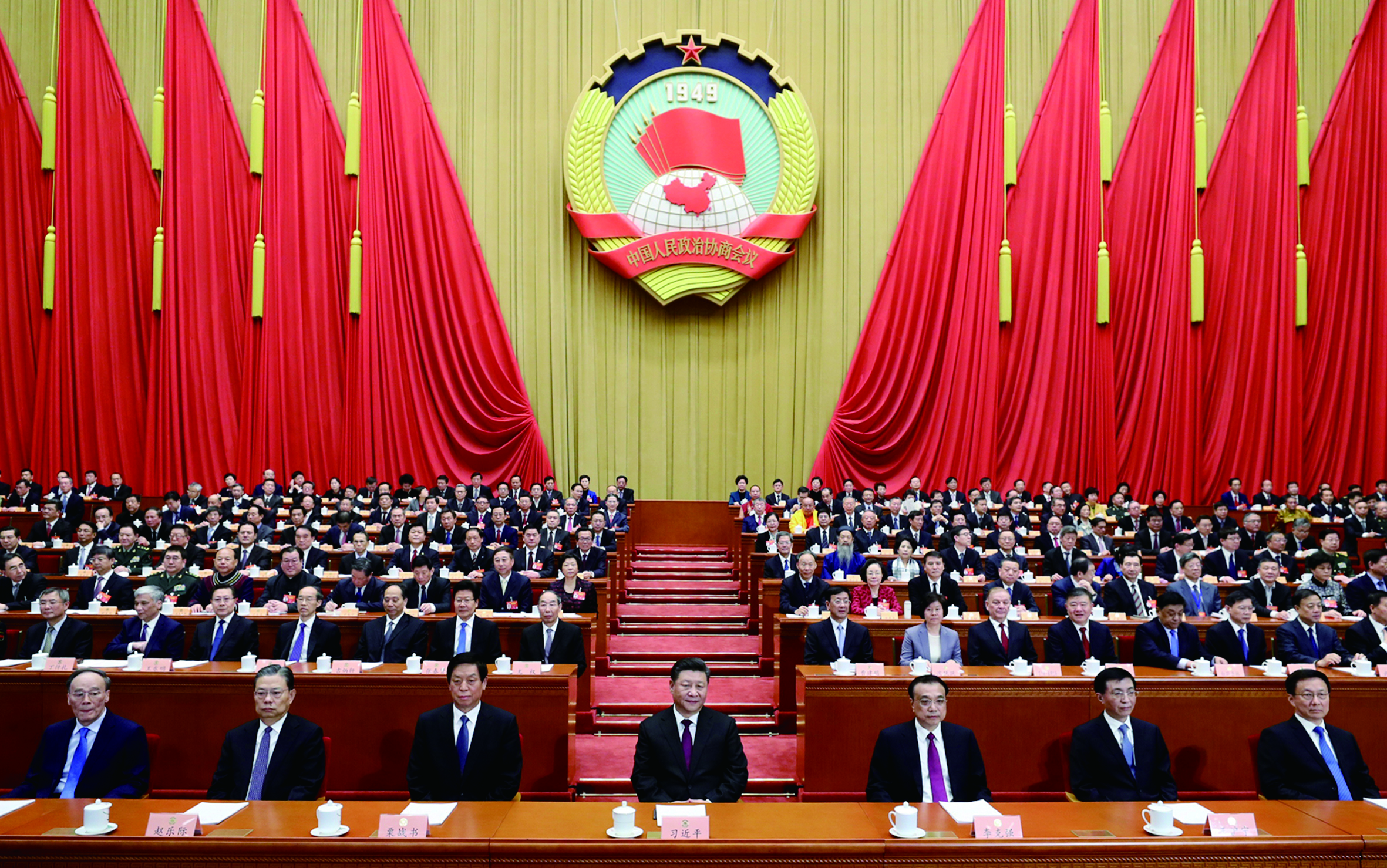 3月3日,中國人民政治協(xié)商會議第十三屆全國委員會第二次會議在北京人民大會堂開幕。這是習近平、李克強、栗戰(zhàn)書、王滬寧、趙樂際、韓正、王岐山在主席臺就座。新華社記者鞠鵬攝