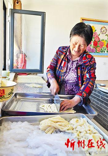 岢嵐縣宋家溝移民新村,沈姚付妻子劉林桃靠制作豆面次粉、蕎面碗托,每月凈收入5000多元。宮清華攝