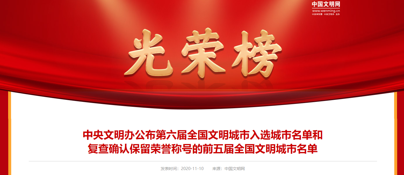 中央文明辦公布第六屆全國(guó)文明城市入選城市名單和復(fù)查確認(rèn)保留榮譽(yù)稱號(hào)的前五屆全國(guó)文明城市名單