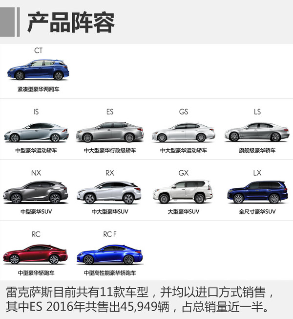 2016年12月,雷克薩斯共售出10,662輛,同比增長(zhǎng)5.3%;1-12月累計(jì)銷量達(dá)109,150輛,已經(jīng)超額完成10萬(wàn)輛的銷量目標(biāo)。在各大豪華品牌不斷加深國(guó)產(chǎn)化進(jìn)程的現(xiàn)階段,雷克薩斯自2004年建立獨(dú)立經(jīng)銷商網(wǎng)絡(luò)后,一直保持以進(jìn)口方式銷售的豪華品牌。在十多年的發(fā)展中,其產(chǎn)品矩陣越來(lái)越豐富。