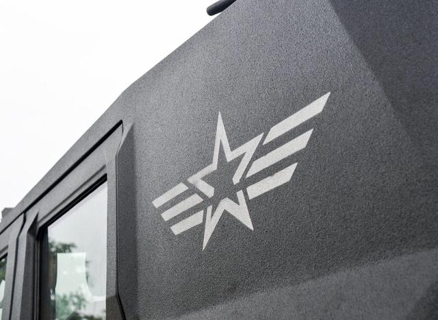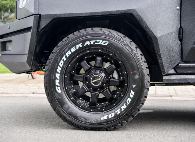 車身表面使用了亞光色涂裝,披上厚重的鋼板并經過高溫噴砂處理,車窗采用了高強度復合玻璃,厚度比起一臺iPhone7還要厚。幾乎全車做過了防彈處理和碳纖維處理,側面還取消了C柱和D柱,換裝了具有一定防爆能力的輪胎,據(jù)說輪胎支持在全部破損的情況下勻速行駛。