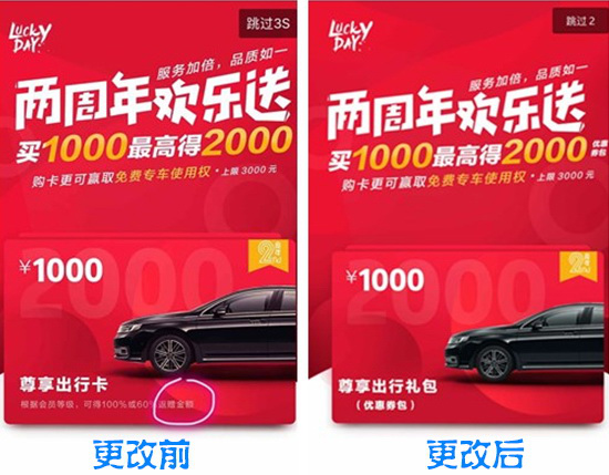 首汽約車App宣傳海報前后對比:“返贈金額”變成了贈送“優(yōu)惠券包”