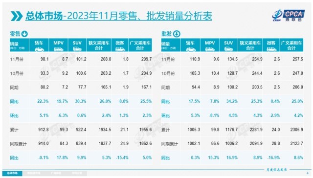 零售方面,據(jù)乘聯(lián)會統(tǒng)計,2023年11月,乘用車市場零售達到208.0萬輛,同比增長26.0%,環(huán)比增長2.4%。今年累計零售1934.5萬輛,同比增長5.3%。
