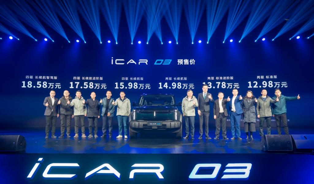 12月18日,“iCAR 03全球預(yù)售發(fā)布暨iCAR零碳智慧工廠開(kāi)放日”在安徽蕪湖舉行,其中iCAR 03開(kāi)啟預(yù)售,新車(chē)擁有兩驅(qū)和四驅(qū)共6個(gè)版型,提供6種外觀車(chē)色和2款內(nèi)飾配色選擇,官方預(yù)售價(jià)12.98萬(wàn)元起。