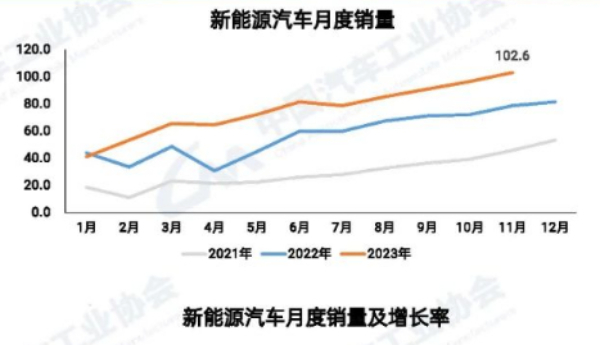 據(jù)中汽協(xié)數(shù)據(jù)顯示,2023年11月,我國汽車產量創(chuàng)歷史新高。汽車產銷量分別完成309.3萬輛和297萬輛,同比分別增長29.4%和27.4%。其中,新能源汽車月度產銷量首次雙超百萬輛,站上新臺階。11月,新能源汽車產銷量分別完成107.4萬輛和102.6萬輛,同比分別增長39.2%和30%。