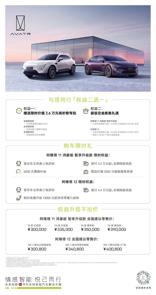 權(quán)益一,1月8日后購車的用戶贈(zèng)送限時(shí)價(jià)值26,000元高階智駕包,以不依賴高精地圖的NCA帶來全域都領(lǐng)先的高速城區(qū)泊車全覆蓋體驗(yàn)。權(quán)益二,活動(dòng)期間購車用戶可享5倍定金膨脹禮遇,5000定金抵扣25,000元車款,車價(jià)立減兩萬元。與此同時(shí),阿維塔推出更多貼心限時(shí)權(quán)益:首任車主終身三電質(zhì)保,6000元置換補(bǔ)貼即刻擁有;另外,全系車主可享智能香氛系統(tǒng)贈(zèng)送,并擁有首付4.2萬元起、全期限超低息的購車金融權(quán)益。與此同時(shí),阿維塔 11 鴻蒙版智享升級款全國零售價(jià)30萬- 39萬元,真正做到產(chǎn)品升級不加價(jià)。